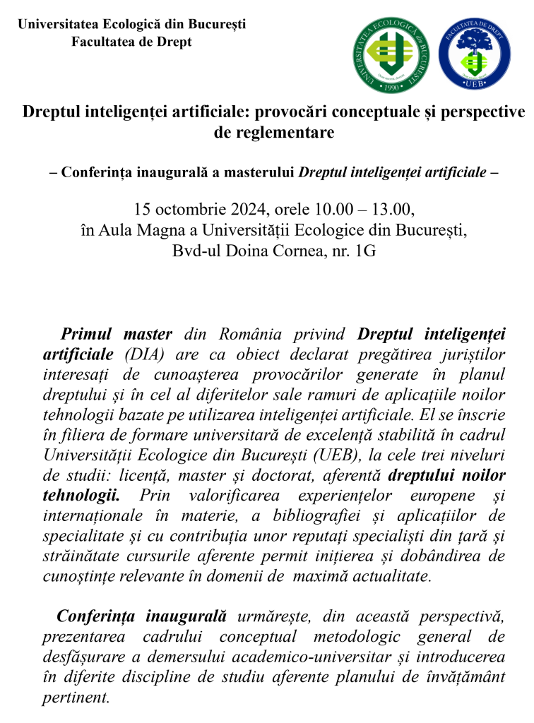 Dreptul inteligentei artificiale: provocari conceptuale si perspective de reglementare Conferinta inaugurala a masterului Dreptul inteligentei artificiale